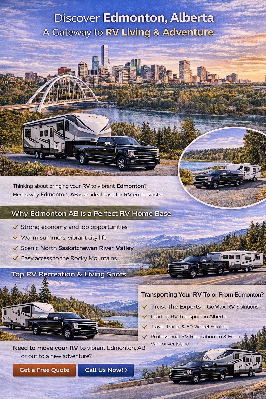 GoMaxRV can haul your 5th wheel or travel trailer between British Columbia and Alberta, so you can focus on the fun parts: exploring Edmonton’s river valley, checking out the city’s huge attractions, and using Edmonton as your gateway to Alberta’s best camping and tourism routes.