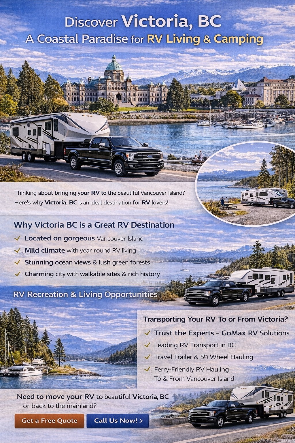 And when it comes to safely transporting your travel trailer or fifth wheel to Victoria — or back from Vancouver Island to the mainland — GoMax RV Solutions is the expert partner you can trust.